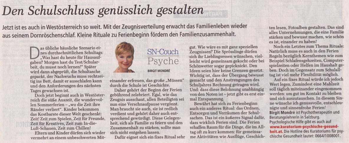 Salzburger Nachrichten vom 05.07.2013: "Schulschluss für geplagte Eltern - Den Schulschluss genüsslich gestalten"